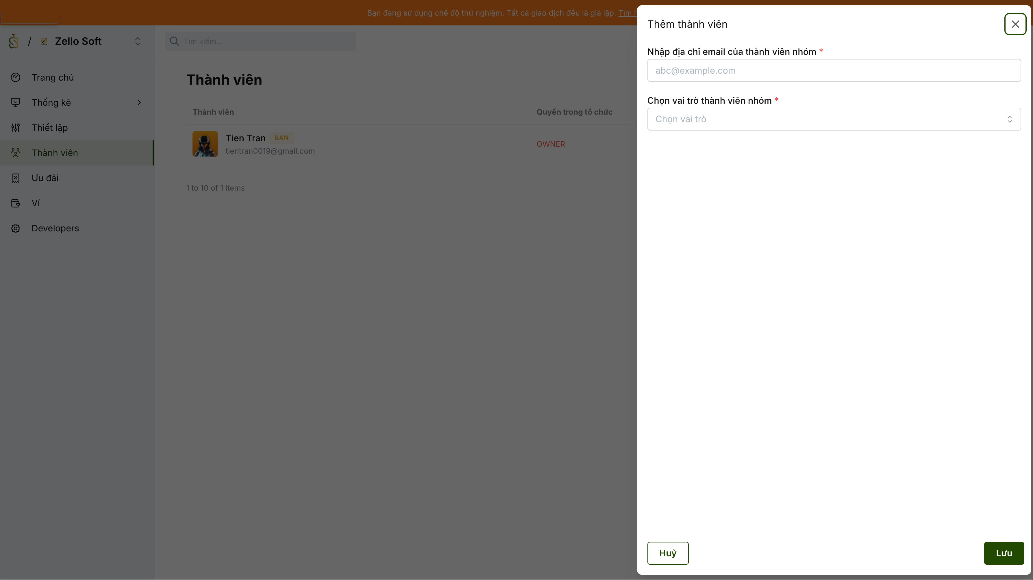 Nhập email của thành viên bạn muốn thêm vào tổ chức